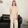 Sıfır Yaka Oversize İki İplik Tişört – Bej